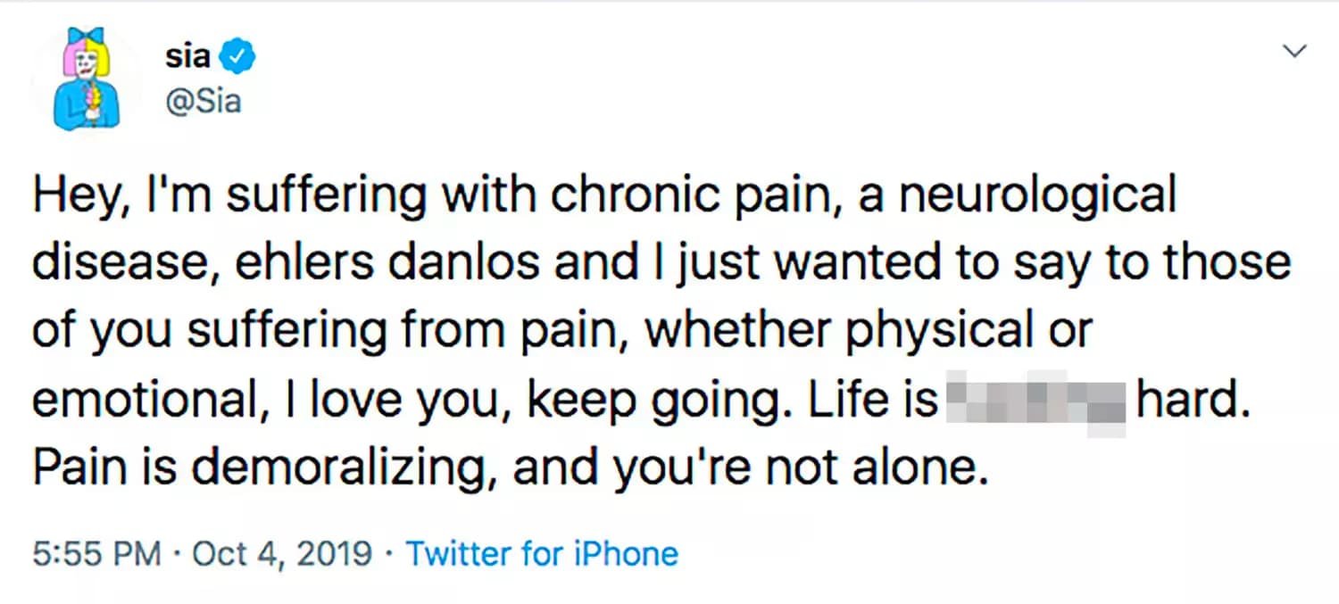Sia, the celebrated singer-songwriter known for her powerful vocals and innovative music, disclosed in 2019 that she has been confronting not only the demands of fame but also a debilitating health struggle. In a courageous and candid revelation, Sia shared that she is battling a chronic pain, a neurological conditon, and Ehlers Danlos Syndrome. She announced on twitter to her followers, “Hey, I’m suffering with chronic pain, a neurological disease, Ehlers-Danlos and I just wanted to say to those of you suffering from pain, whether physical or emotional, I love you keep going,” She continued saying, “life is f*cking hard. Pain is demoralizing, and you’re not alone.”