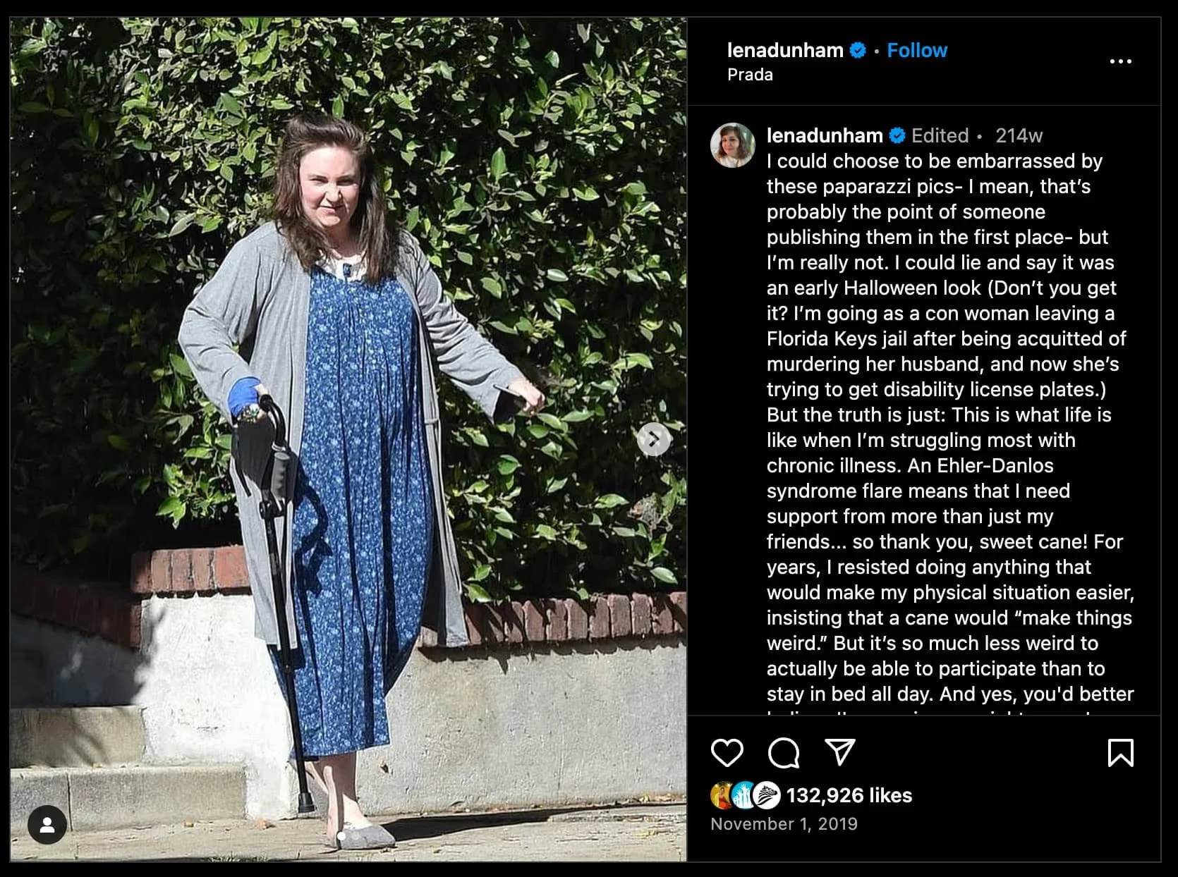 Lena Dunham, the actress and writer, has been open about her struggle with Ehlers-Danlos Syndrome (EDS). She was photographed using a cane after leaving a doctor’s appointment in Los Angeles. Rather than concealing her situation, Dunham decided to address it directly and shared the photo on Instagram, explaining that she was going through an EDS flare-up and needed the support of a cane. She acknowledged that using a cane was a significant step for her, as she had resisted it in the past, but she recognized that it allowed her to participate in life more fully. Dunham also humorously mentioned wearing her nightgown outside, emphasizing the importance of comfort during her health struggles.