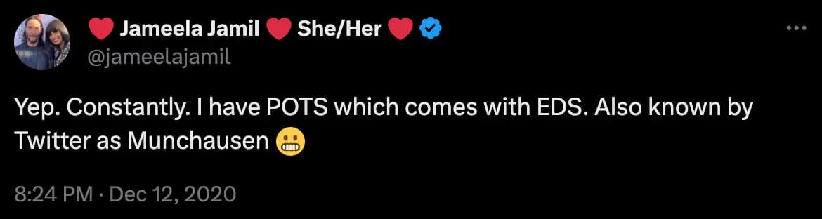 Her dedication to advocacy is more than skin deep. Since her diagnosis, Jamil has used her platform to raise awareness about Ehlers Danlos. During an interview with Karina Sturm for Abilify, Jamil said that she is ““I am an advocate first, and everything else last.” During the same interview, Jamil pointed out the difficulty of living with EDS due to lack of recongition. She said “Ehlers-Danlos syndrome is always at the forefront of your mind because it affects every single cell in your body, and so every micro decision you make is in consideration of Ehlers-Danlos syndrome.” Despite her diagnosis and advocacy, people have accused her having Munchausen syndrome, a factitious disorder, which is a mental illness that causes people to fabricate health scares for attention. She told Abilify, “For someone to discard that just because you look ‘Ok,’ according to their own Bible of ableism, it’s very hurtful.”